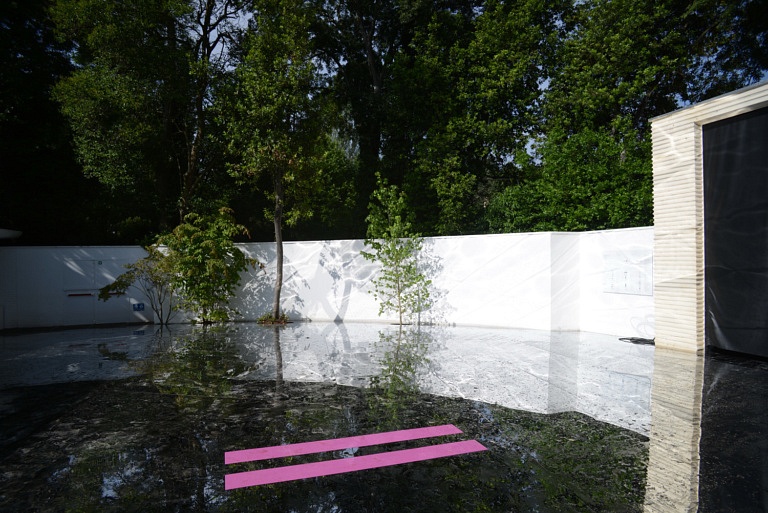 Vale per la “Sfera 1: 50.000″ di LAAC. Il progetto parte dalla pianta del padiglione austriaco costruito nel 1934 da Josef Hoffmann e Robert Kramreiter; venti anni dopo Hoffmann aggiunge nel cortile un muro curvo. L’installazione spaziale interpreta questo gesto come una “deviazione”. Alla base, la superficie circolare specchiante deforma (devia) la nostra consueta relazione con gli elementi tettonici ed esprime una dualità dello spazio. Lo spazio architettonico si piega, distorce luogo e persone, trasportandoci, almeno nelle intenzioni, in un’altra situazione, oltre il dato reale e l’immaginabile. In questo modo, la parte specchiante diventa lo strumento della deviazione. La simmetria è distrutta e la deviazione espande gli spazi reali del padiglione. La deviazione non vuole essere solamente un effetto visivo ma attraverso la sua materia trasparente, riflettente opalescente, lo sferoide esalta la percezione di influenze atmosferiche come luce, temperatura e pioggia. La sfera non definisce una forma statica dello spazio ma, piuttosto, quella che emerge attraverso la sua interazione con l’ambiente circostante.