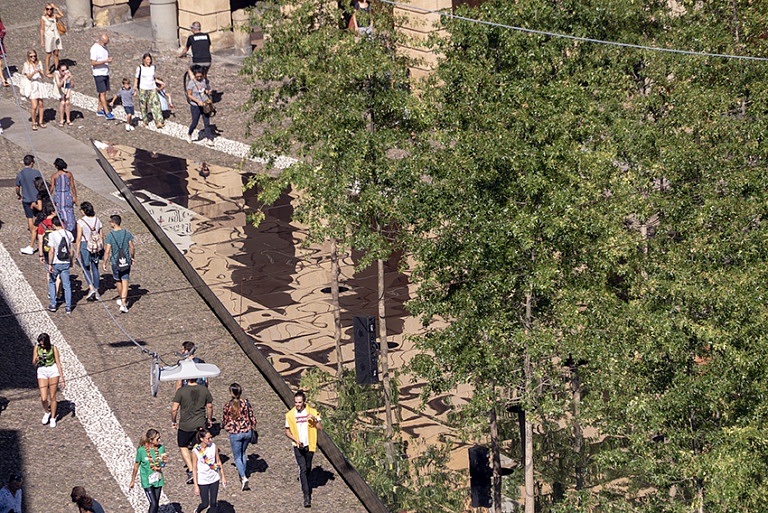 L’allestimento consiste in una sorta di bosco urbano in miniatura – 40 querce palustri, i cui vasi restano nascosti da una superficie riflettente, poetico sguardo rivolto al cielo -, unito a una serie di gradoni che definiscono uno spazio scenico, rivoluzionano una delle piazze storiche più celebri della città felsinea.