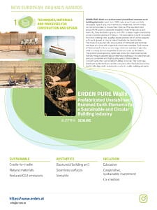 Technological and constructive proposal for prefabricated and unstabilised “bricks” (ie without cement added) in rammed earth, made of 100% natural and completely recyclable material. The composition allows a passive regulation of the internal space temperature and humidity control. The raw material is earth extracted from local construction sites, so it “redeems” a waste product. Prefabrication optimizes production and construction by innovating an ancient and labor-intensive technique.