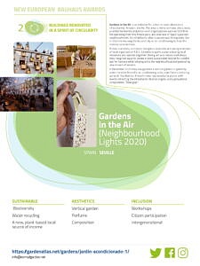 The method adopted by the European Commission for the awarding went through different phases and moments. In the first, the projects were selected with a sort of ‘popular’ votation among all subscribers to the NEB website, in the second the jury made up of the program partners’ members chose the prizes among 30 + 30 nominations from the short-list: half of the finalist projects is Spanish, 5 Italian, 2 German, 2 Portuguese. The others from Austria, France, Cyprus, Belgium, Poland and Romania.
