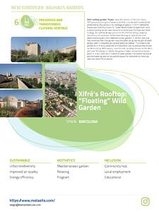 The project builds a series of “floating” gardens on the roof of a 10-storey building, the Els Porxos d’en Xifré. Result of a competition, it preserves the original structure and materials, transforming the roof into a rediscovered and unexpected Mediterranean garden, structurally autonomous: with earth dunes, benches, paths accessible to residents as a rediscovered meeting space. It aims to have a high local ecosystem impact with ponds, bird nests and over 50 plant species. It is energy self-sufficient thanks to solar panels, harvested rainwater collection and composting.