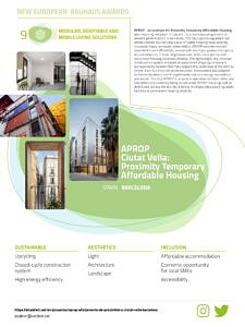APROP is an acronym for “Proximity Temporary Affordable Housing” and is a program of Barcelona municipality to prevent gentrification. It offers evicted families decent, sustainable and affordable emergency housing in their neighborhood, pending long-term housing solutions. It is a lightweight, modest and modular construction system that uses assembled shipping containers with facades that aim to build a visual relationship with the urban landscape of the historic center. Each building can be dismantled, transported and adapted to the next destination.