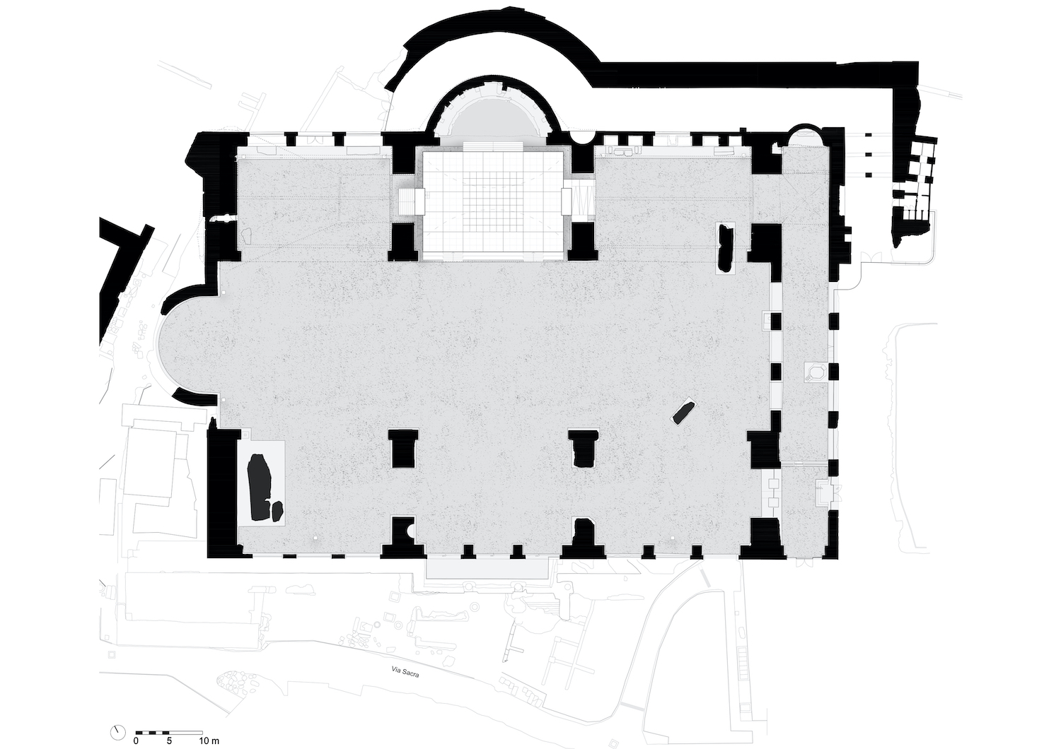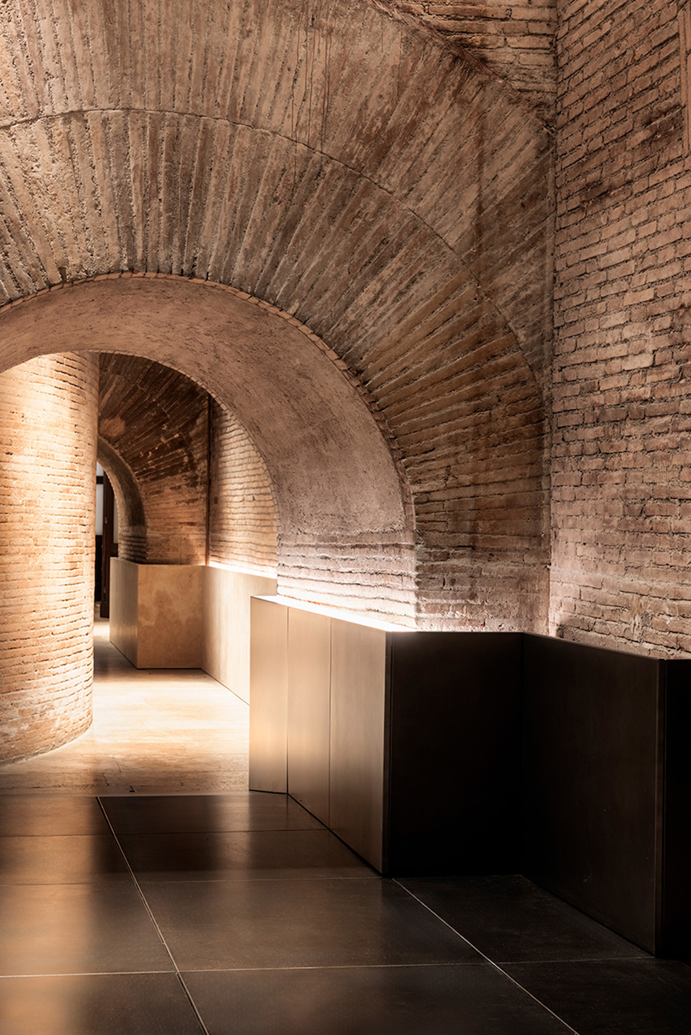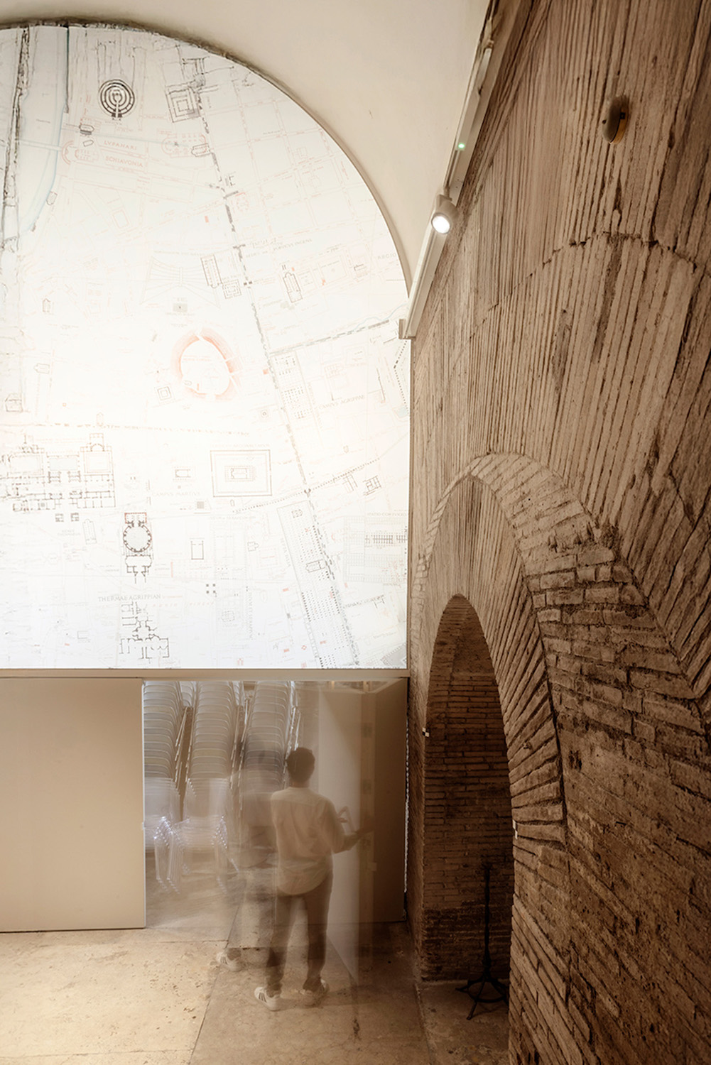 L’intervento dello studio STARTT – finanziato dal MiC – si inserisce silenziosamente tra le pieghe della storia con un progetto che affronta l’accessibilità degli spazi, il riordino dell’impiantistica e il restauro delle superfici. L’accesso agli ambienti attigui alla Rotonda avviene dal fossato ovest del monumento attraverso una rampa metallica (color bronzo) che collega l’esterno con la cappella della Basilica Santa Maria ad Martyres. Da qui si raggiunge lo spazio planimetricamente opposto al pronao del Pantheon, ora riorganizzato con una partizione mobile che nasconde il magazzino e ospita, nella porzione superiore, la celebre forma urbis di Rodolfo Lanciani.