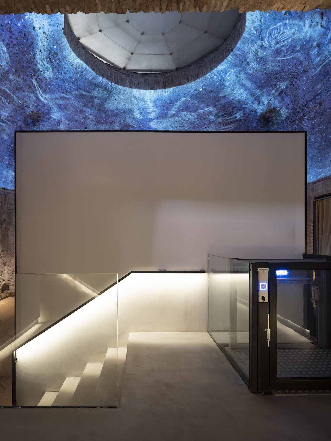 La luce artificiale è infine la materia intangibile che accompagna la discesa verso la Sala Ottagona (l’Approdo) trasformando la struttura metallica (costituita da profili HEB autoportanti) in una promenade eterea che culmina in un pannello verticale neutro con duplice funzione: nascondere la piattaforma elevatrice dalla Sala e fungere da supporto per le proiezioni immersive. L’intervento di Boeri Architetti è ora parte del nuovo circuito di visita della Domus inaugurato nel dicembre 2024.