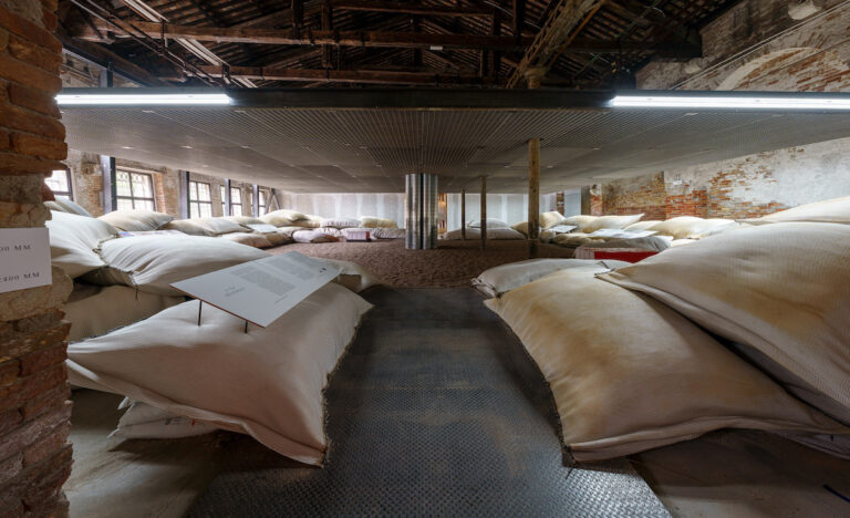 Largo e ampio, è delimitato da un’accumulazione di sacchi, usati in verità per arginare le esondazioni, che si offrono subito alla vista come un giaciglio accogliente. Al centro alcune condutture cilindriche verticali suggeriscono il funzionamento della macchina che riesce ad offrire il conforto di un respiro fresco che filtra dalle griglie a soffitto. L’installazione mette in scena un microambiente fatto di temperatura, umidità, condensa che ci invita ad un’esperienza reale basata su un sistema di raffrescamento passivo esterno ispirato alle tecniche tradizionali del Bahrain.
