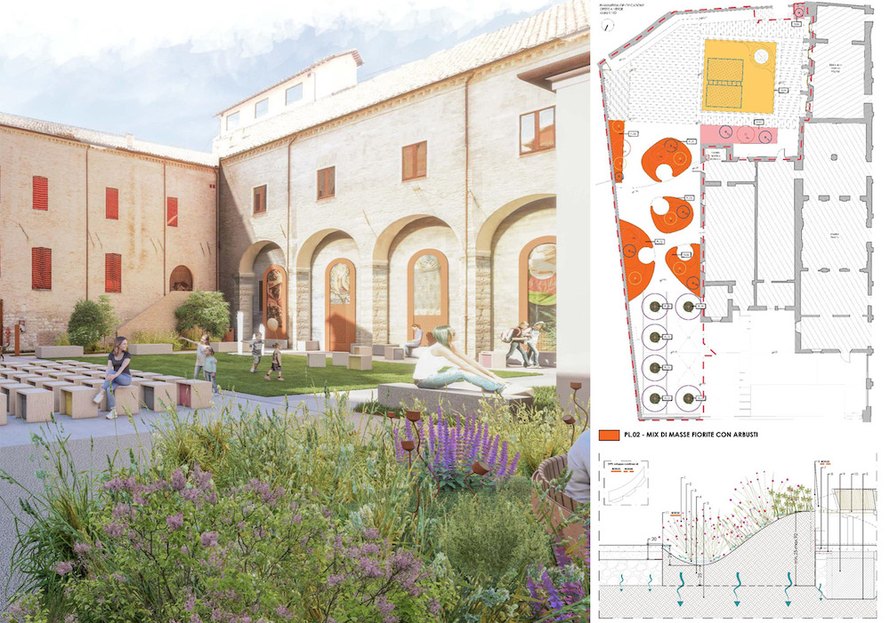 Sul piano delle pratiche progettuali, numerosi esempi hanno mostrato come la transizione ecologica possa radicarsi negli spazi quotidiani. Interventi di rigenerazione di chiostri storici e di aree urbane degradate o sottoutilizzate hanno dato vita a spazi verdi resilienti, dotati di rain garden, pavimentazioni drenanti e sistemi di raccolta e riuso delle acque piovane. Anche i siti UNESCO hanno costituito laboratori di innovazione, dimostrando come la conservazione del patrimonio possa dialogare con infrastrutture verdi capaci di mitigare l’isola di calore e di rafforzare il senso di appartenenza collettiva. In questi progetti lo spazio pubblico si configura come piattaforma socio-culturale, capace di accogliere funzioni diverse e di adattarsi nel tempo.