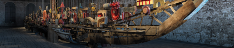 La grande sorpresa della Biennale 2016 salpa da Istanbul, viaggia sulle acque del Mediterraneo e arriva all’Arsenale. Un vascello metaforico assemblato con oltre 600 pezzi di recupero, lungo 30 metri, pesante 4 tonnellate, in parte appoggiato al pavimento, in parte sospeso alle travi in legno. Un collage etereo di colori e forme che, teatralmente illuminato, affascina e colpisce.